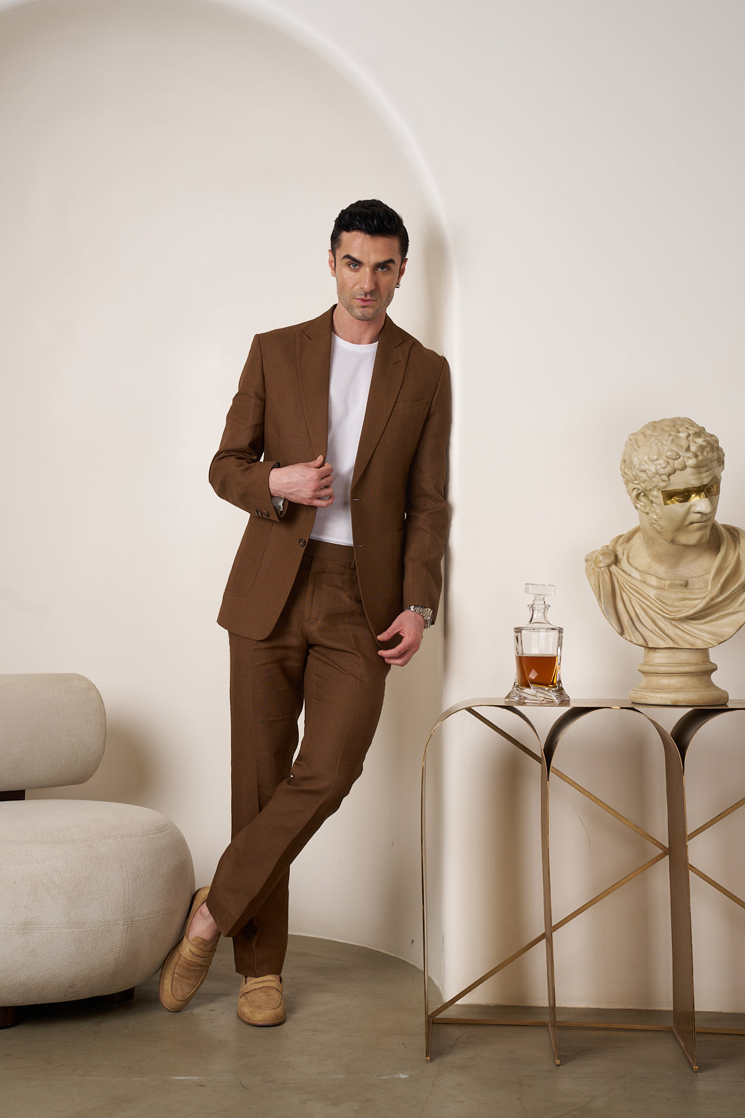 An ode to refined dressing. Crafted from the world’s finest pure linen and exceptional Italian wool, each suit balances lightness with natural structure, allowing elegance to unfold with ease. Woven using the highest thread counts, the Italian wool lends quiet depth and fluidity to the silhouette.