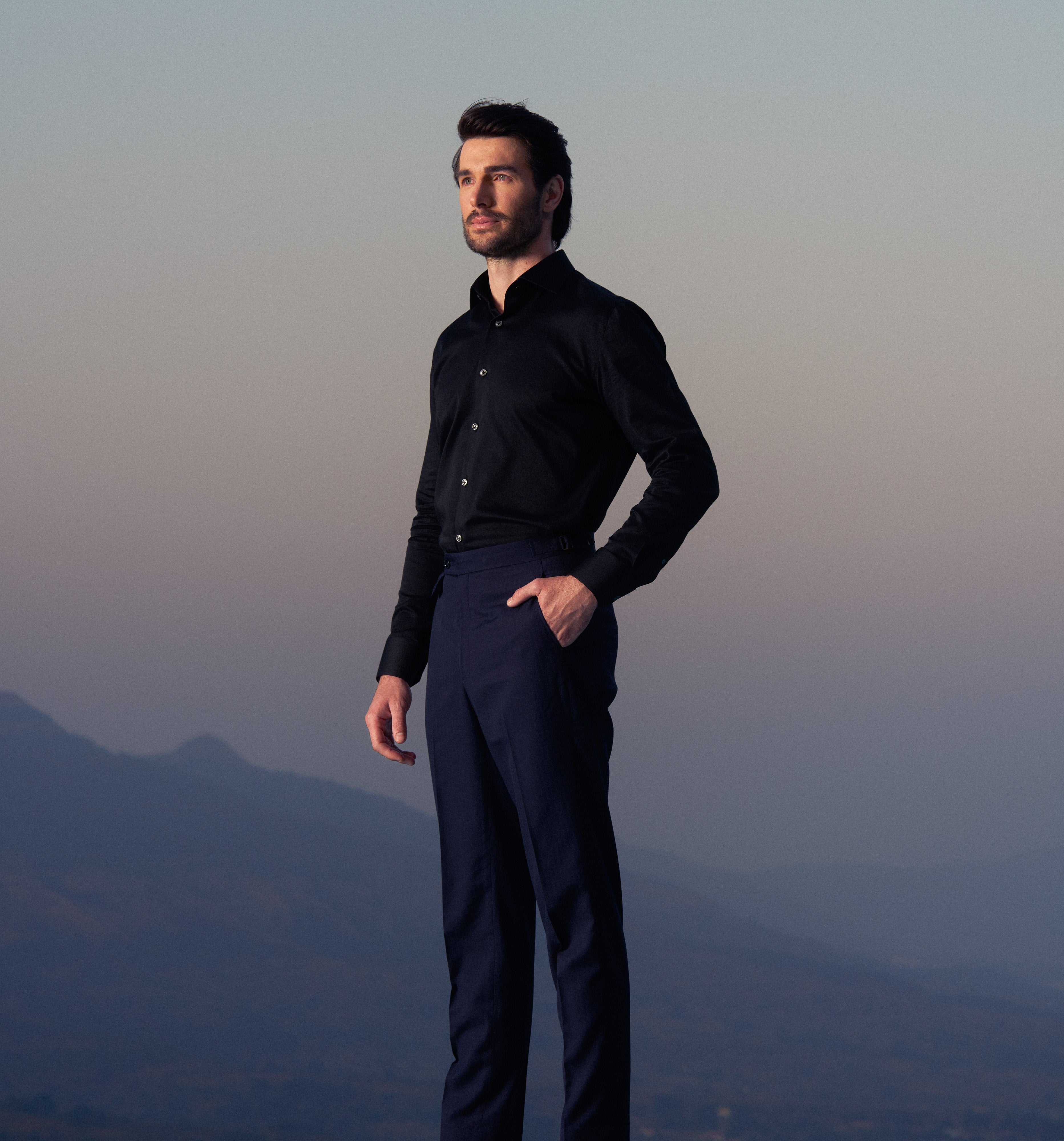 Crafted from exceptionally fine merino wool, Riccaro Corduso Wool Trousers embody an understated purity of design. The fabric is light yet assured, fluid yet composed, allowing the silhouette to settle naturally with quiet confidence. There is no excess only intention where every line, every proportion, serves a purpose. From the discreetly finished waistband to the soft, uninterrupted drape, these trousers are designed to be experienced rather than observed. A study in ease and elegance, they reflect a refined way of dressing where sophistication is instinctive, and luxury is simply felt.